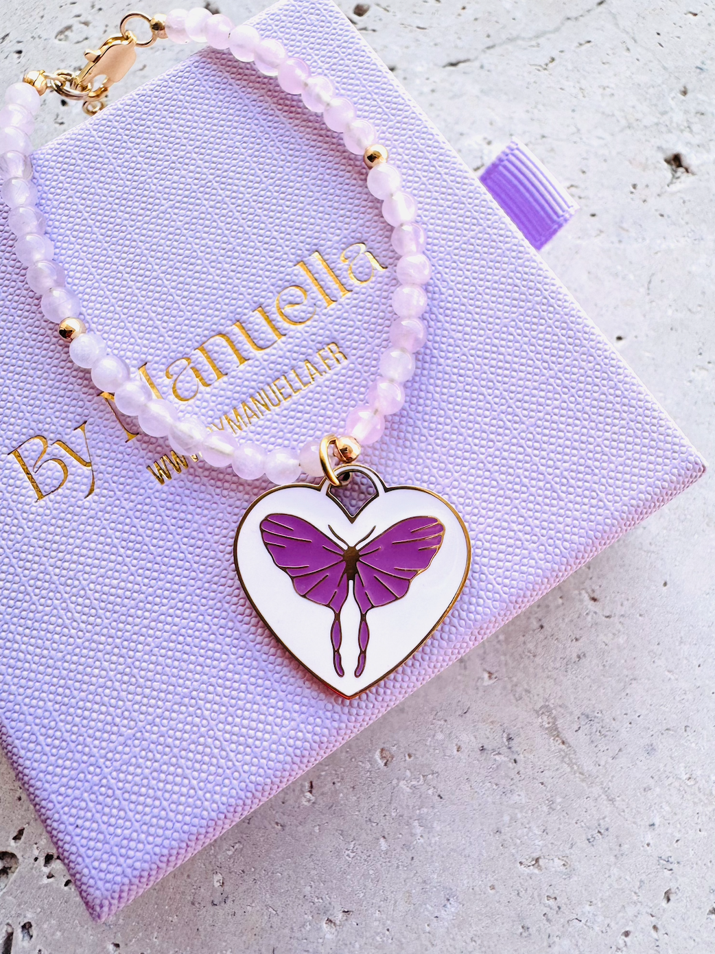 Ce modèle exclusif met en scène un papillon délicatement illustrée par la créatrice, émaillée à la main, le tout suspendu à un bracelet de pierres fines soigneusement sélectionnées.
