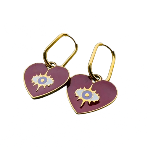Ce modèle exclusif illustré pour la créatrice, posé sur un cœur émaillé à la main, le tout suspendu à une créole ovale dorée.